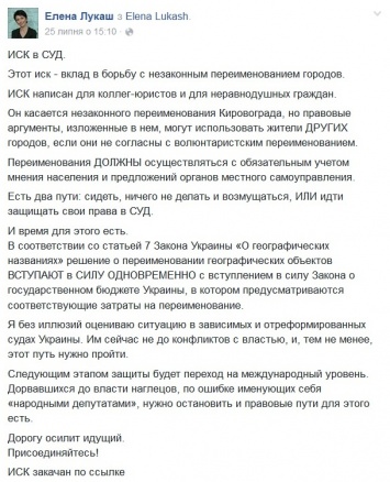 В то же время, на своей странице в ФБ Елена Лукаш написала, что правовые аргументы из исков кировоградцев могут быть использованы и жителями других городов, переименование которых состоялось вопреки мнению местной громады. “ Правовые аргументы, изложенные в нем, могут использовать жители других городов, если они не согласны с волюнтаристским переименованием. Переименования должны осуществляться с обязательным учетом мнения населения и предложений органов местного самоуправления. Есть два пути: сидеть, ничего не делать и возмущаться, или идти защищать свои права в суд”, - написала она.